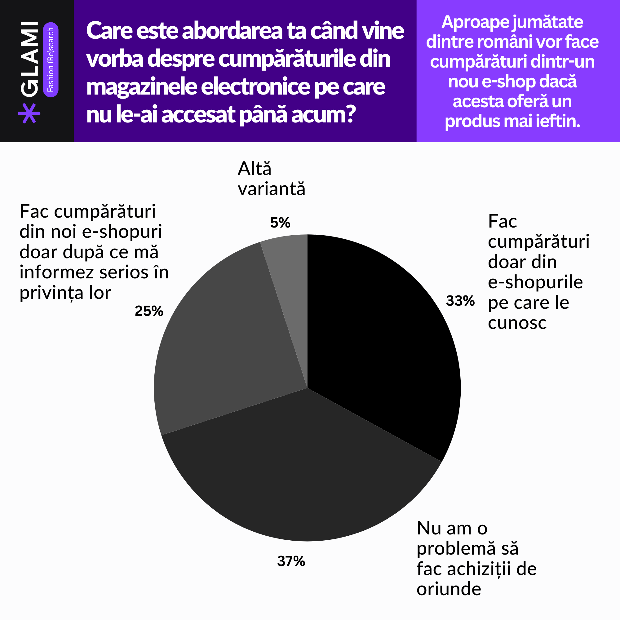În plus, 37% dintre ei nu sunt mai îngrijorați decât de obicei cu privire la siguranța informațiilor personale atunci când utilizează acest tip de e-shopuri. Iar când vine vorba despre regrete, 66% dintre români nu se simt absolut deloc vinovați pentru că se numără printre consumatorii de ultra-fast fashion. De asemenea, un procent de 39% nu ar fi de acord cu interzicerea acestor magazine pentru a ajuta producătorii și companiile locale, întrucât ar presupune un preț mai ridicat pentru achiziționarea unor produse similare.