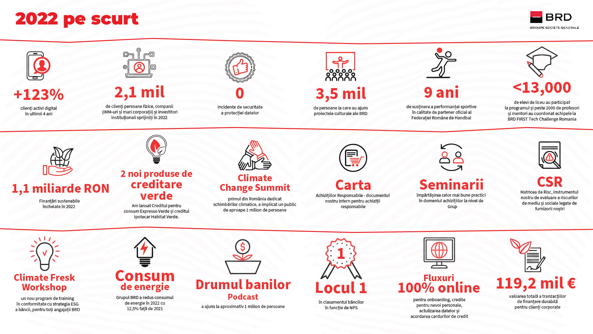 Impactul social al BRD a crescut și el în 2022, fiind atinse peste 3,5 milioane de persoane doar în zona proiectelor culturale. Prin Fundația 9 și platforma de sustenabilitate Lumea9 au fost organizate și sprijinite noi evenimente și proiecte în cultură, artă, film, muzică, mediu, tech, educație, sport, printre care amintim: