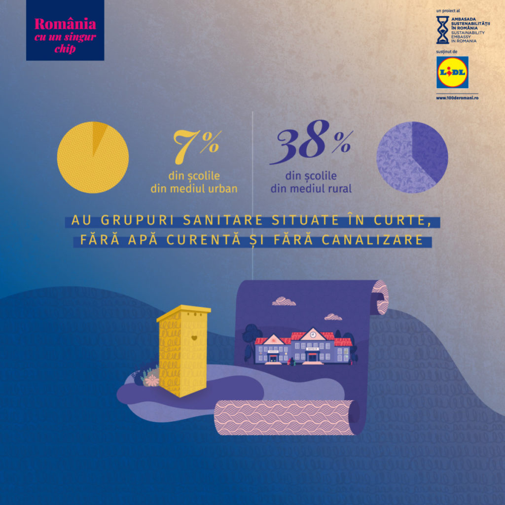 - 38% din școlile din mediul rural au grupuri sanitare situate în curte, fără apă curentă și fără canalizare. În mediul urban, 7% din școli au aceleași condiții.