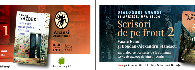 Cel de-al doilea eveniment din această serie, „Scrisori de pe front 2”, plănuit pentru data de 15 aprilie, de la ora 18.00, pe paginile de Facebook #Anansi și #LaDouăBufnițe, îi aduce față în față pe scriitorii Vasile Ernu și Bogdan-Alexandru Stănescu, protagoniștii unor dialoguri despre literatură care au fermecat în trecut sute de cititori. Pretextul întâlnirii îl constituie ediția în limba română a unuia dintre cele mai puternice romane semnate de Martin Amis. Este vorba despre Zona de interes (traducere de de Mihaela Ghiță), o carte năucitoare, tăioasă, asemenea unei oglinzi ce pare a realiza imposibilul: să pună în scenă o poveste autentică de dragoste ce se desfășoară într-un lagăr nazist, un triunghi amoros care-și trăiește micile drame pe fundalul unei „banalități a răului” cutremurătoare.