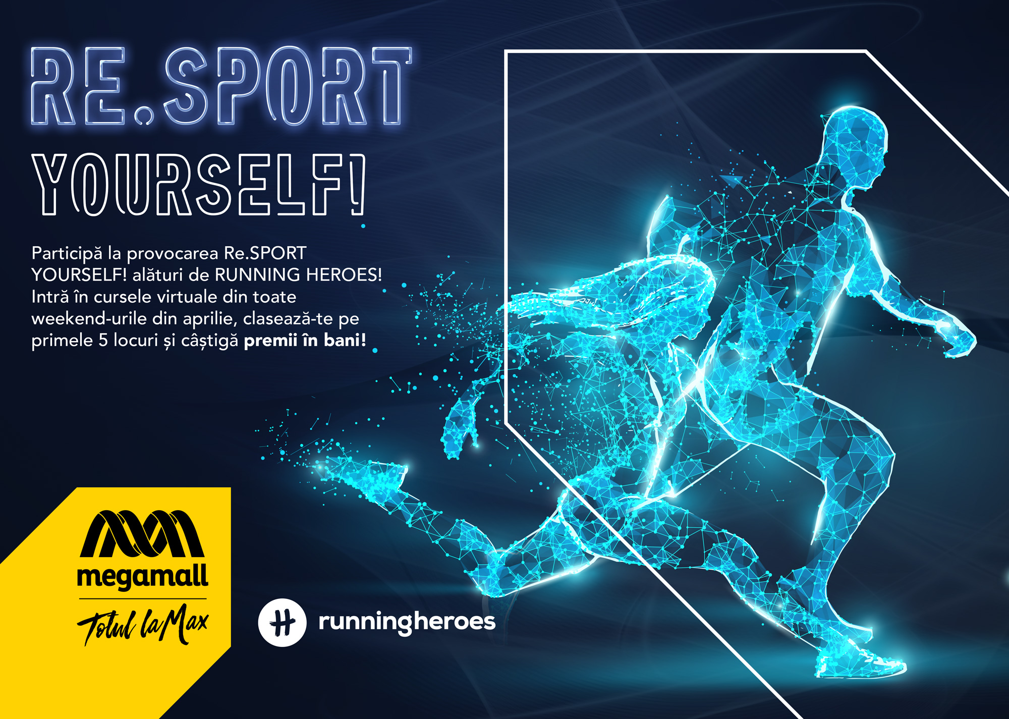 În aprilie, Mega Mall, alături de Running Heroes, recreează atmosfera Jocurilor Olimpice și lansează provocarea Re.SPORT YOURSELF!, adresată tuturor pasionaților de mișcare. Începând cu 10 aprilie, cei interesați se pot înscrie la o serie de provocări sportive virtuale, inspirate de probele olimpice de atletism. Spiritul competitiv și kilometrii acumulați prin mers sau alergare le pot aduce participanților vouchere de cumpărături la Mega Mall. Organizatorii au pregătit curse de weekend și săptămânale, cu diverse grade de complexitate, la care participanții se pot înscrie accesând aplicația Running Heroes.
