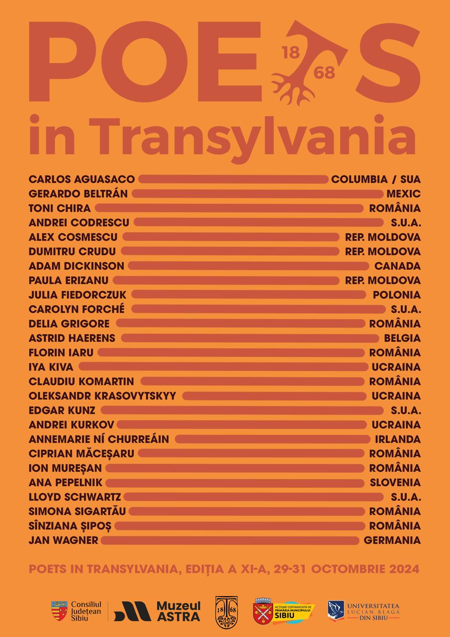 Poets in Transylvania. Festivalul Internațional de Poezie de la Sibiu este organizat de Muzeul ASTRA & Revista Transilvania, cu cofinanțare de la Primăria Municipiului Sibiu prin Agenda Culturală și în parteneriat cu Universitatea „Lucian Blaga” din Sibiu.