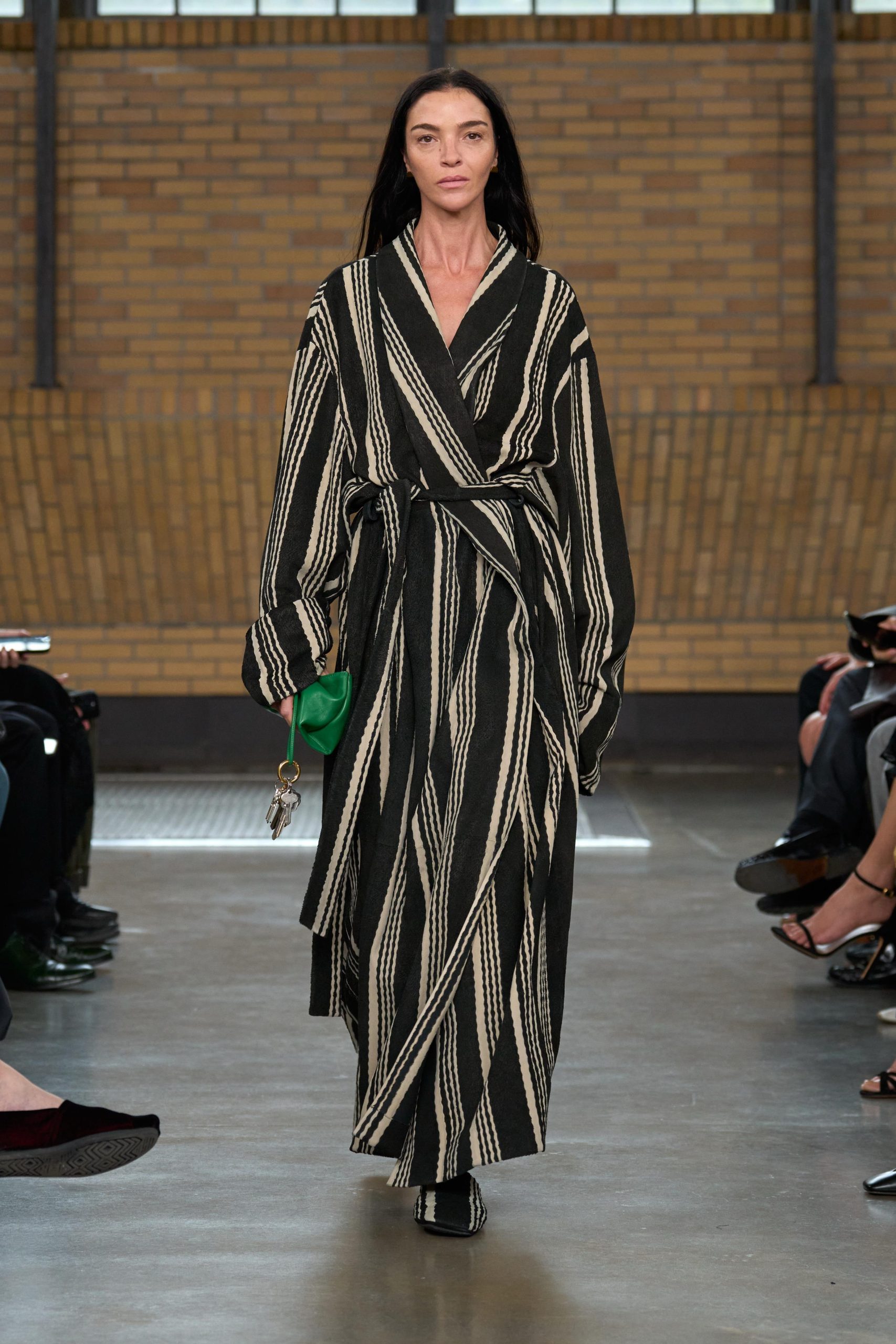Lenjeria intimă devine protagonistă, influența sa apărând în variații ale topului tip camisole și slipului, accente de dantelă și curele pentru ochelari, apoi explodând într-o rochie din tweed fără cusături, țesută cu logoul iconic al mărcii pe talie. În ceea ce privește îmbrăcămintea, siluetele variază de la înalte și zvelte la scurte și decoltate, până la largi și stratificate, cu croieli precise, drapaje fluide și detalii cu franjuri. Lâna croită, țesăturile tehnice spălate și ceruite, tricourile fluide și mătasea sunt oferite într-o paletă urbană neutră de alb, negru și gri, cu note de roz, cărămiziu, albastru deschis și ferigă. Țesăturile, în special pielea, capătă noi texturi tactile – tăiate cu laser pentru a arăta ca materialul terrycloth; asamblate în intarsie; tăiate manual și croșetate în rochii cu franjuri.