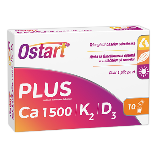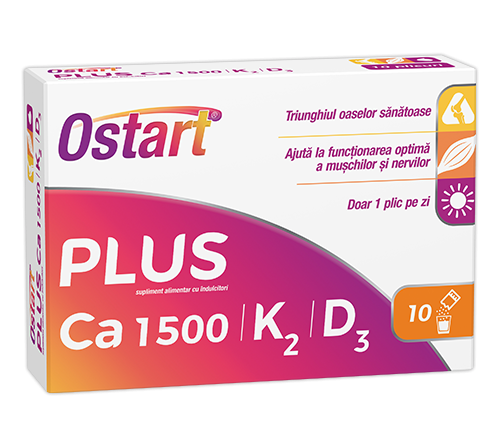 Plicurile Ostart®Plus Ca 1500 + K2 + D3 oferă un aport substanțial de minerale și vitamine (calciu, vitamina Ks și D3) într-o formă de administrare plăcută: plic ce se dizolvă în apă. Formula respectă principiul ”triunghiului osului sănătos”.